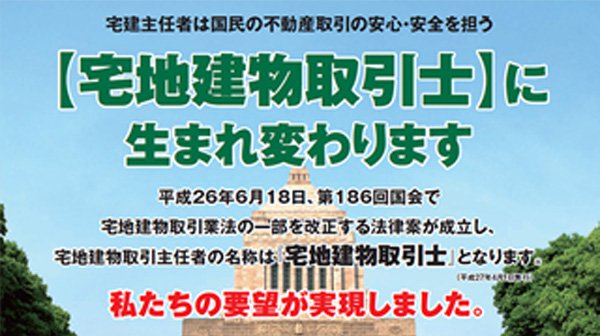 2014年(平成26年)6月18日、第186回国会で「宅地建物取引業法の一部を改正する法律案」が成立し、宅地建物取引主任者の名称が、『宅地建物取引士』になりました<2015年(平成27年)4月1日施行>。私たち宅建政治連盟の要望が実現しました。