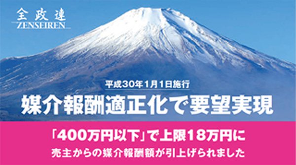 2017年(平成29年)12月8日に宅地建物取引業者の媒介報酬額の告示が改正され、2018年(平成30年)1月1日から施行されました。全政連が重点要望として展開していたもので、半世紀ぶりの報酬額告示の改正となりました。