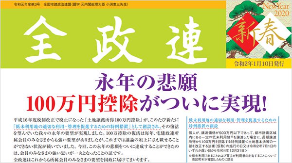 長年、制度の復活を訴えてきた、低未利用地などを譲渡した場合に長期譲渡所得の金額から100万円を控除する特例措置が2020年度(令和2年度)税制改正で実現しました。