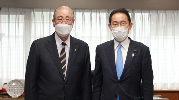 全政連・瀬川信義会長(当時・写真左)は2021年9月7日、東京・全宅連会館で、自民党前政務調査会長の岸田文雄議員(現総理・写真右)と意見交換し、銀行の不動産仲介業参入問題等を要望しました。岸田氏は「銀行は巨大な力を持っていて、何がみなさんの幸せになるか注意していきたい」と述べました。